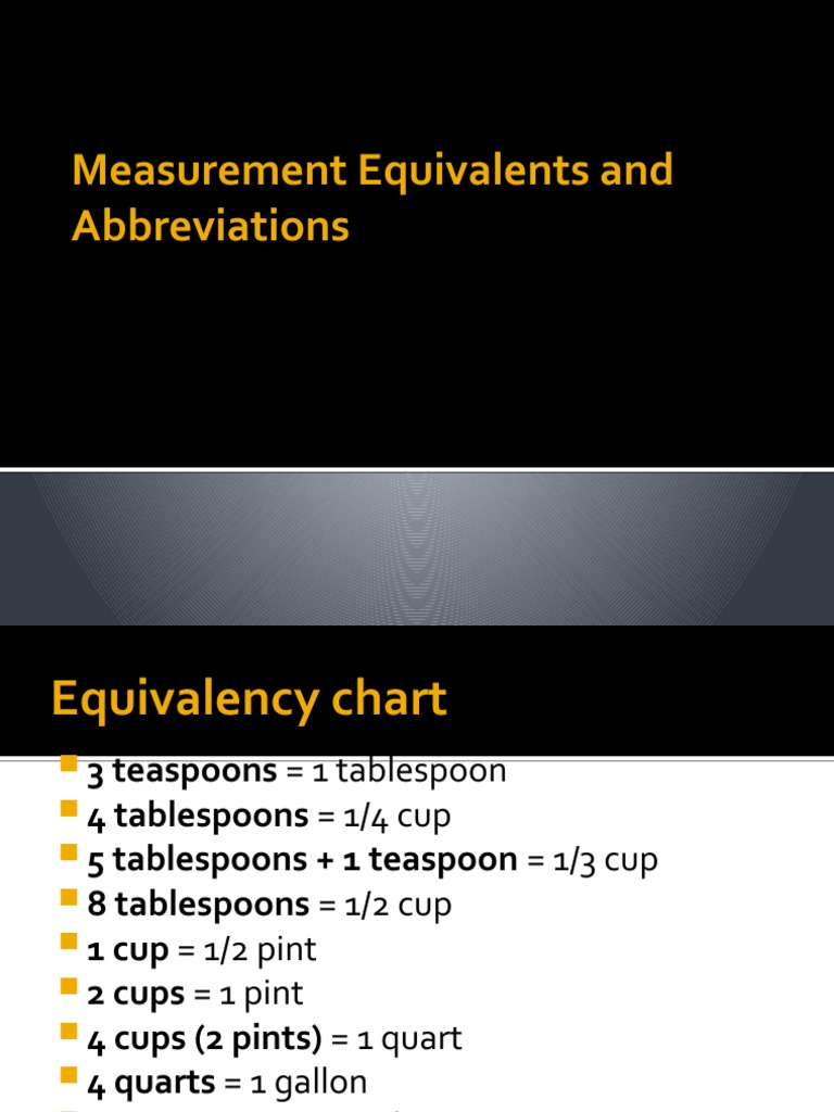 Here are a handful of basic measurements (us standard) and conversions and their abbreviations the everyday cook may encounter.